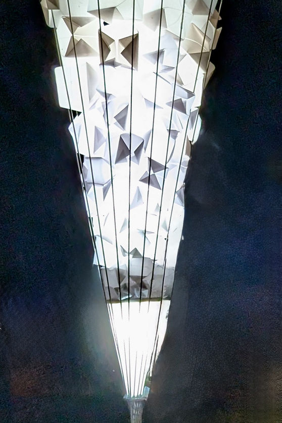Luminous Offering (Korean Moon Jar) was installed along the lantern-lit procession around Green Lake. Built from steel rods, stretch fabric, and over 300 vellum origami units around battery-powered LED lights, the sculpture stood 7 ft tall (with a 3 ft spherical base and a 4 ft vertical extension). The light patterns refracted through the folds created organic, shifting textures. The upward form embodied a flow of energy — a dialogue between offering and receiving — connecting sky, moon, and human presence.